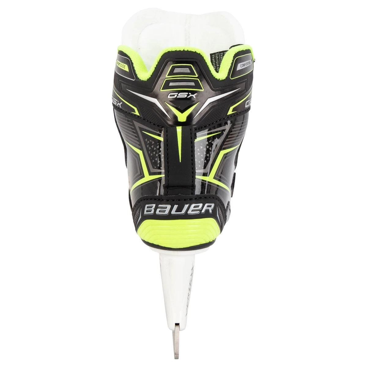 Starting off with the build of the Bauer GSX Junior Skates, the popular cowlingless design makes its return to continue to help the goaltender get a low attack angle which aids in quicker pushes on the ice. The quarter package on the GSX Junior comes with a Fiber Composite with StanceFlex technology. This combination provides a great fit while remaining very light. Moving down to the toe, a Low-Profile Asymmetrical Toe Cap helps protect shots you might take off your skate while reducing the bulk size of the skate in previous models which allows the goaltender to be more precise in every movement on the ice.