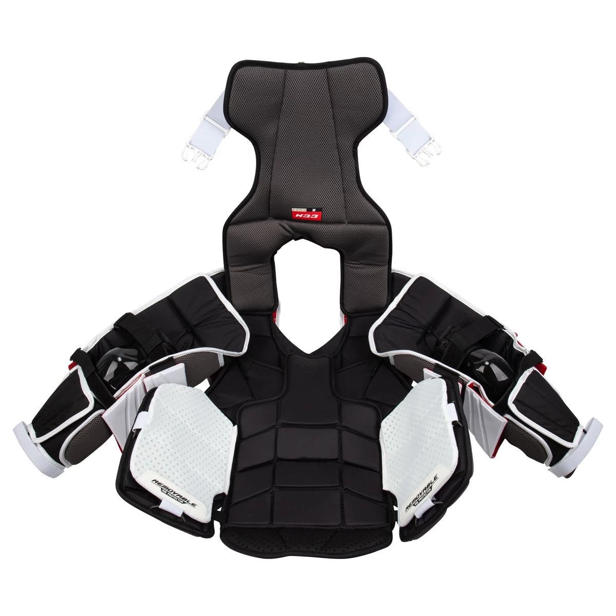 Designed for today’s goaltender, the EF5 Pro includes a new Max Flex fit system which combines ultimate mobility and superb protection. Starting at the shoulders, the EF5 Pro has specific quick release Velcro adjustments for a customizable fit. Directly underneath, the shoulder cap has compression-molded HD foam to protect against hard shots.