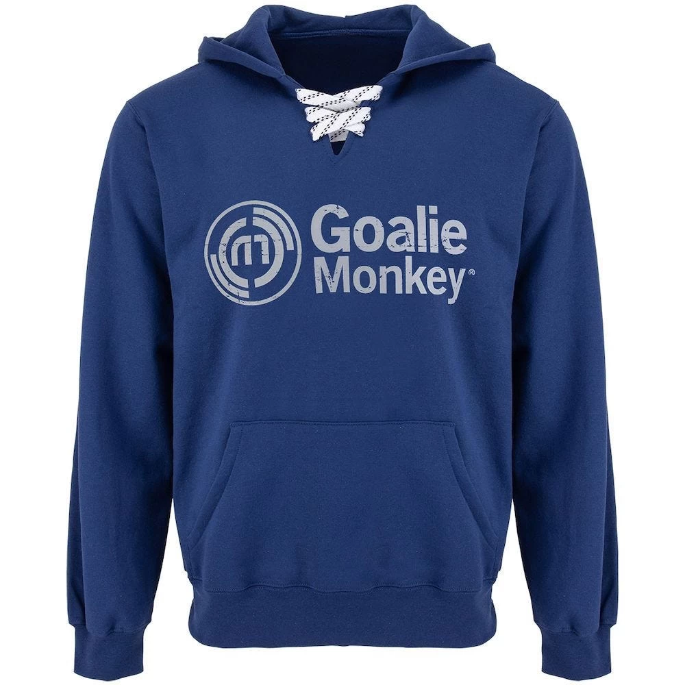On the front, you will find the round MonkeySports logo, adjacent to a GoalieMonkey box logo. Below that, the Lace GoalieMonkey Hoodie features a spacious kangaroo-style pocket.