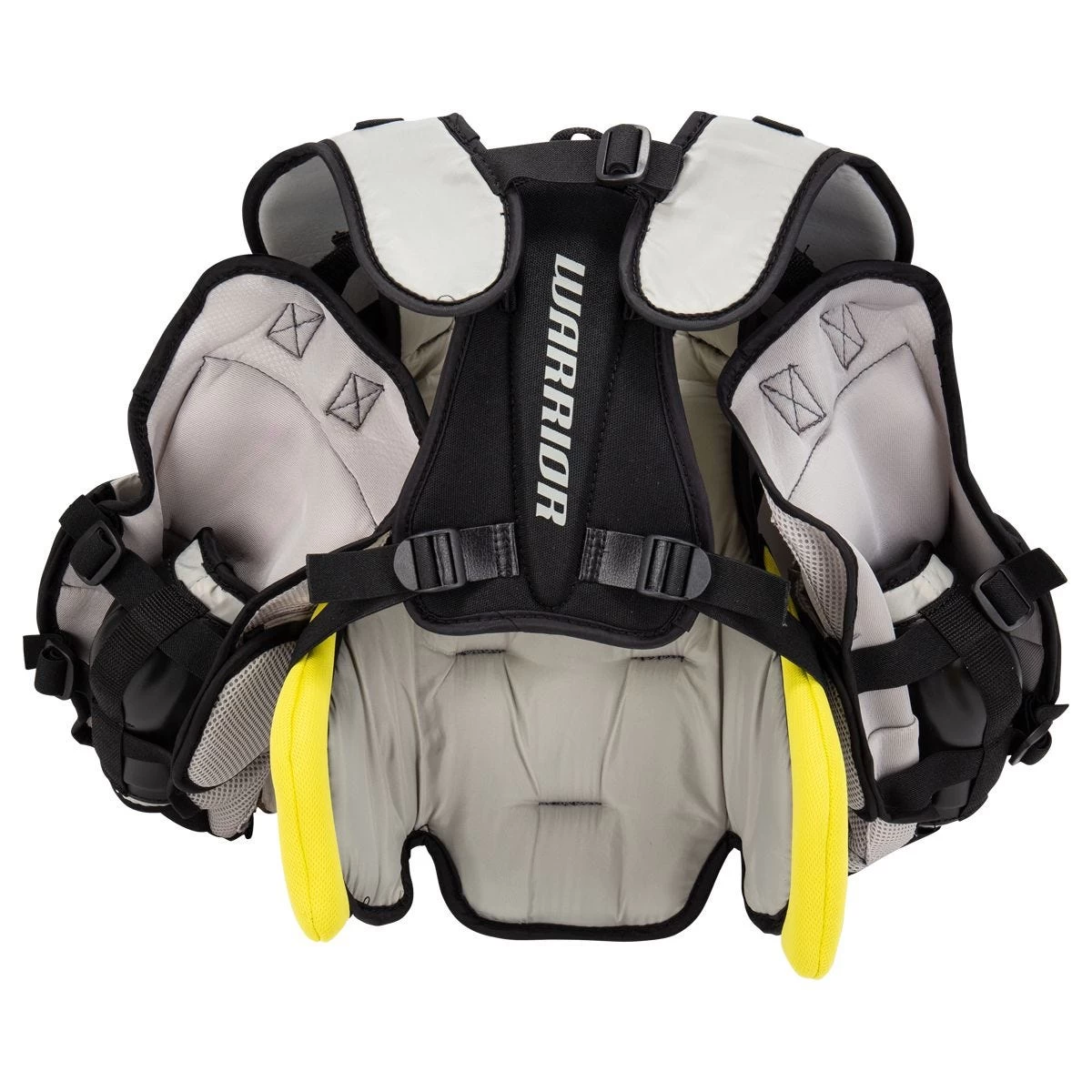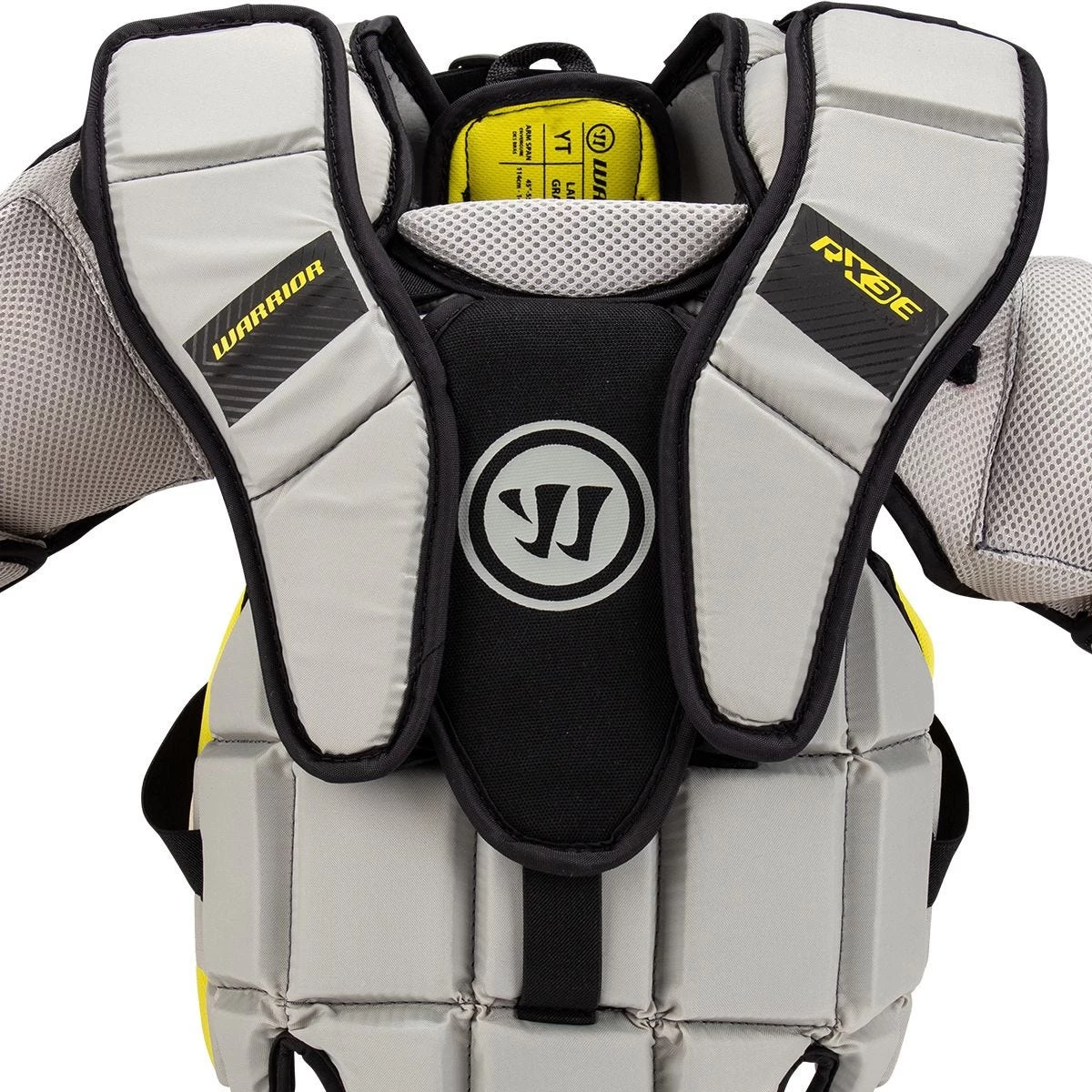 Finally flipping around to the back of the Warrior Ritual X3 E Youth, you will notice straps the run vertically down the plate that work along with the straps connecting from each side of the ribs area and straps on the shoulders to find the exact preferred fit for each goaltender.
